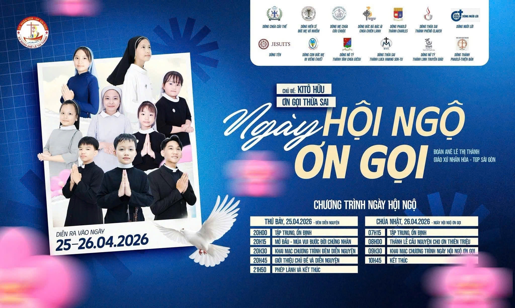 Sự kiện diễn ra trong hai ngày 25–26/4, quy tụ 13 Hội Dòng nam nữ cùng sự hiện diện của quý thầy Học viện Thánh Anphongsô – Dòng Chúa Cứu Thế. Đặc biệt, ngày hội hướng đến việc giúp các bạn trẻ khám phá và sống sứ điệp của Đức Giáo hoàng Lêô XIV trong Ngày Thế giới Cầu nguyện cho Ơn gọi năm 2026, qua đó nhận ra rằng mỗi Kitô hữu đều được mời gọi trở thành chứng nhân thừa sai trong chính bậc sống của mình.