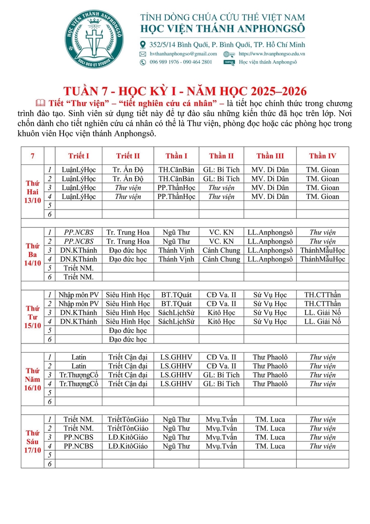 LỊCH HỌC TUẦN 7 - HK I (2025-2026)