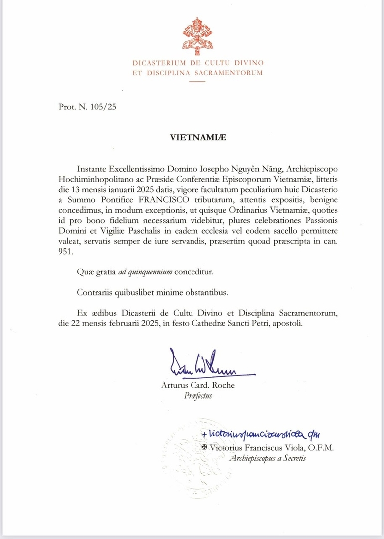 4. Năm 2025, Toà Thánh ban Sắc lệnh cho phép mỗi Đấng Bản quyền tại Việt Nam, bất cứ khi nào xét thấy cần thiết vì lợi ích thiêng liêng của các tín hữu, được phép cử hành nhiều lần Nghi thức Tưởng niệm Cuộc Thương Khó của Chúa và Canh thức Vượt Qua trong cùng một nhà thờ hoặc cùng một nhà nguyện (x. Bộ Phụng tự và Kỷ luật các Bí tích, Sắc lệnh ngoại lệ cho Giáo Hội Việt Nam (2025). Đặc ân này có thời hạn là 5 năm.