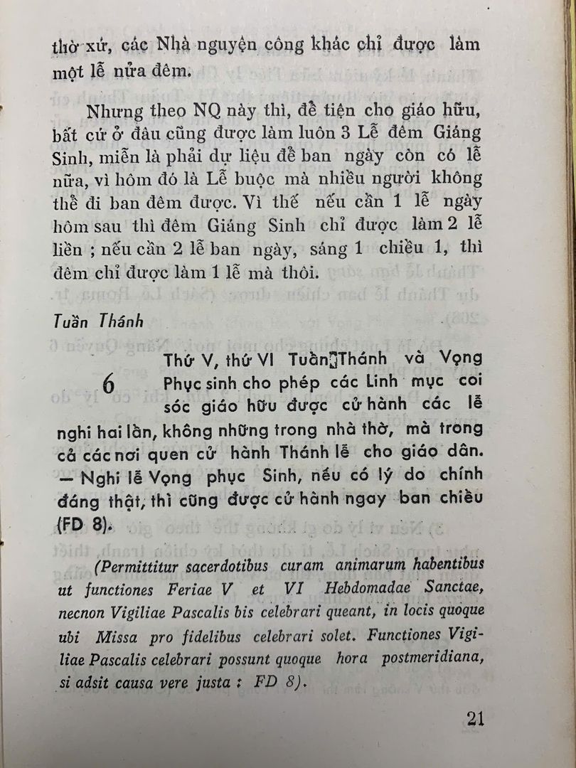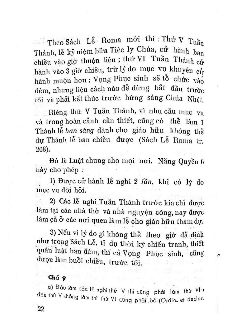 1. Bản Năng quyền thập niên 1970-1980 cho phép: vào thứ Năm, thứ Sáu Tuần Thánh và vọng Phục Sinh, các linh mục coi sóc các giáo hữu được cử hành các lễ nghi hai lần, không những trong nhà thờ, mà trong các nơi quen cử hành Thánh Lễ cho giáo dân. Nghi lễ Vọng Phục Sinh, nếu có lý do chính đáng thật, thì cũng được cử hành ngay ban chiều (Bản năng quyền thập niên 1970-1980, 21).