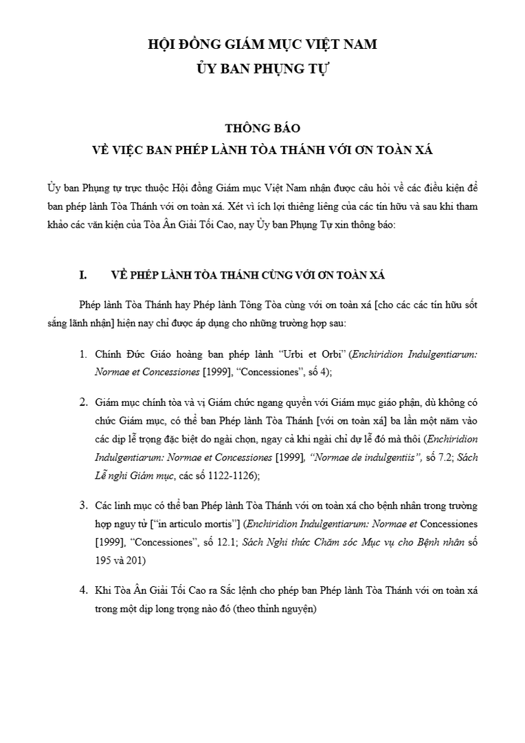 Ủy ban Phụng tự: Thông báo về việc ban Phép lành Toà Thánh với Ơn Toàn Xá